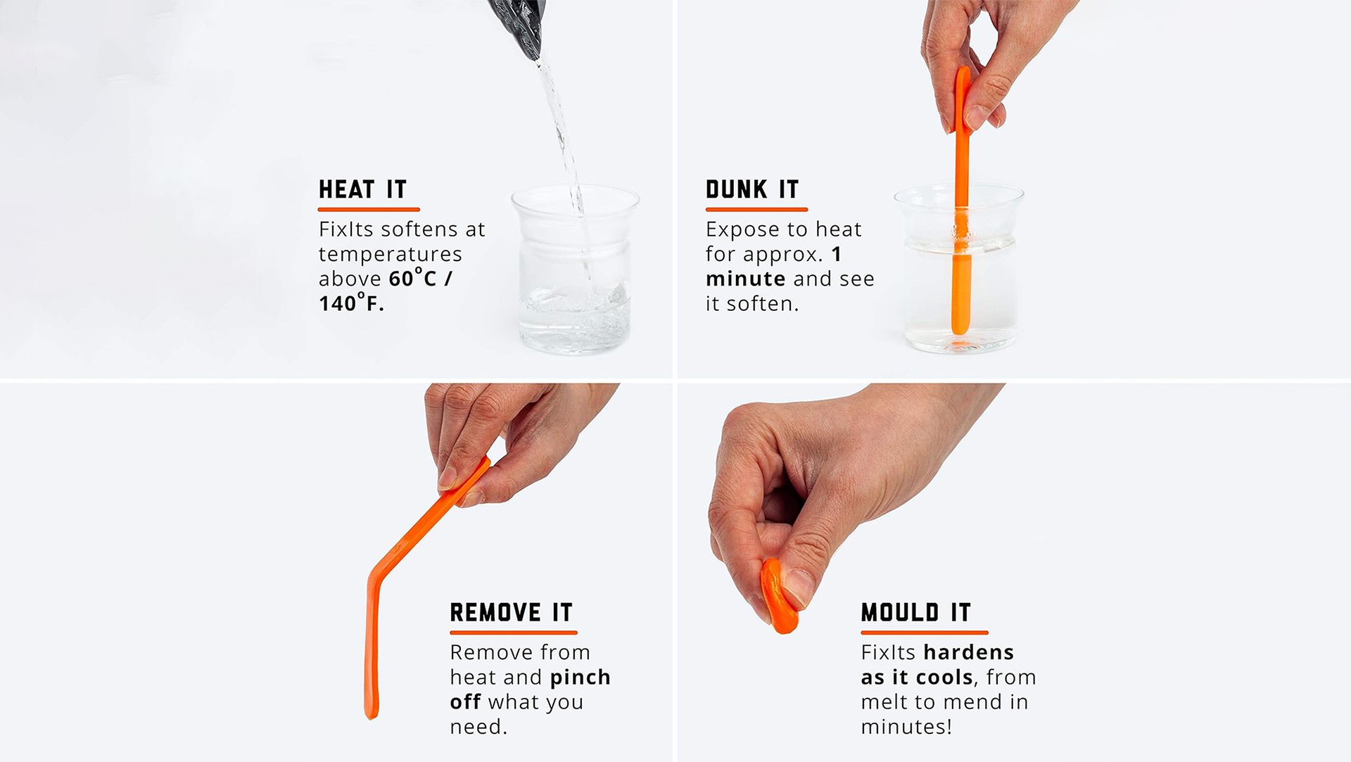 特別な工具は不要 やかんからの熱湯だけでOK 作業場の機材や技術的なスキル、面倒な準備がなくても、誰でもFixItsをうまく使えます。